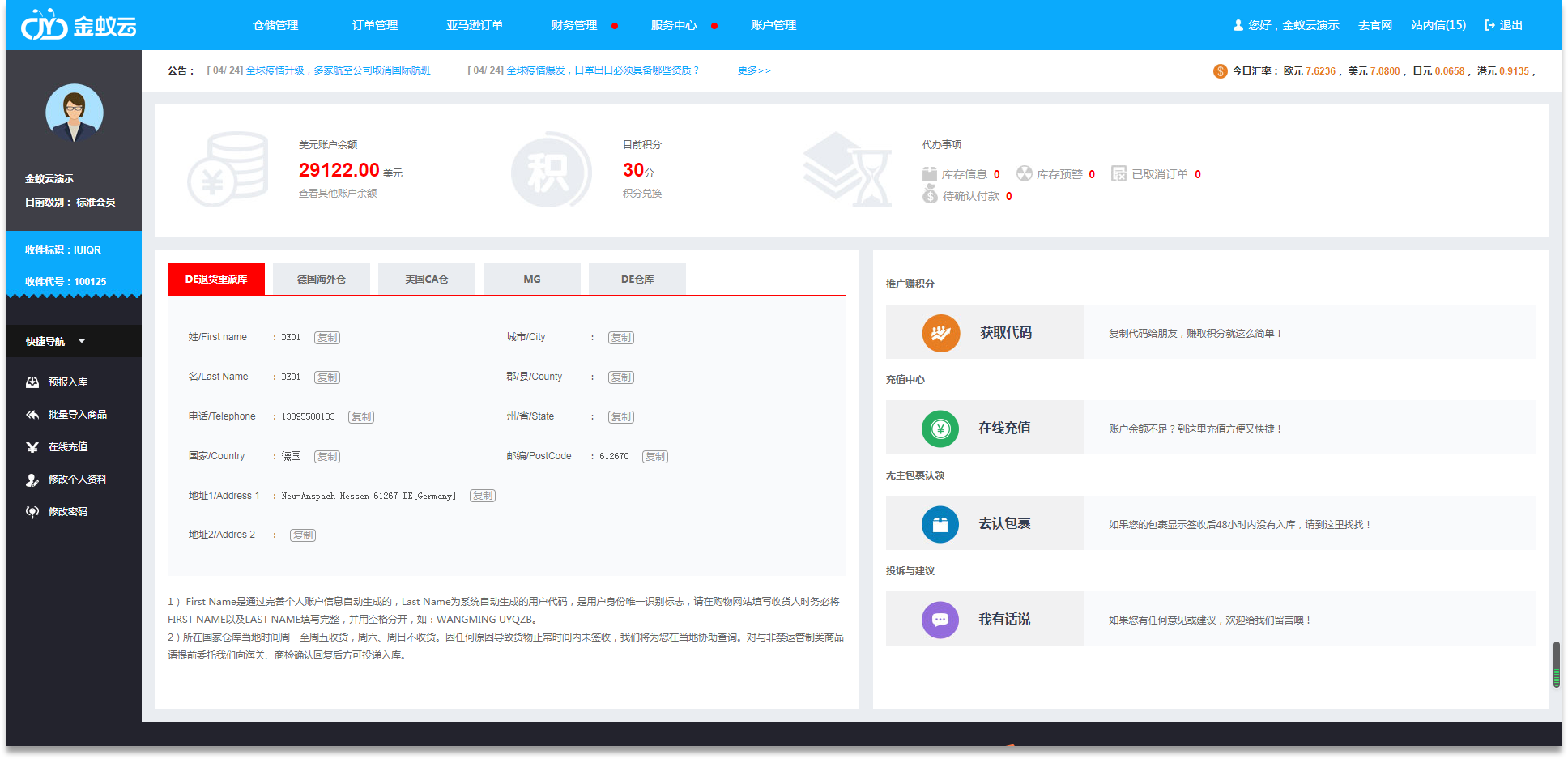 ·會員中心包含用戶等級、功能板塊、快捷導(dǎo)航、公告欄、實時匯率等,界面一目了然,引導(dǎo)用戶快速進(jìn)行操作。