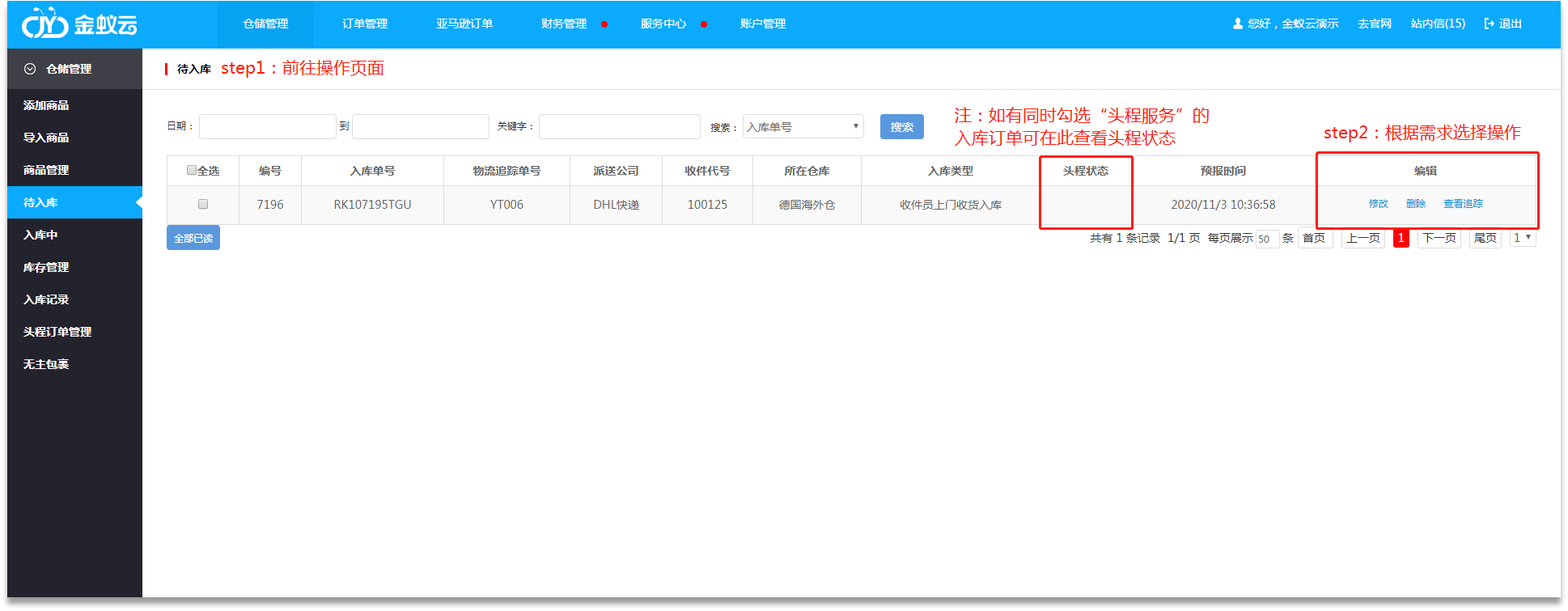 ·用戶提交【入庫】/【退貨入庫】訂單后,在【倉儲(chǔ)管理】-【待入庫】可查看/修改待審核狀態(tài)的入庫訂單。