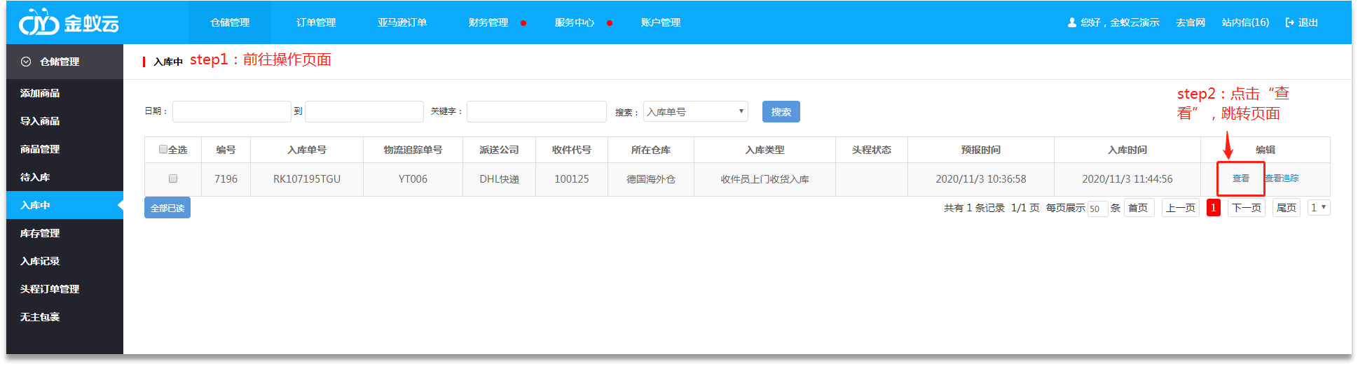 ·用戶查看具體入庫詳情,可在【倉儲(chǔ)管理】-【入庫中】點(diǎn)擊【查看】,跳轉(zhuǎn)入庫詳情頁。