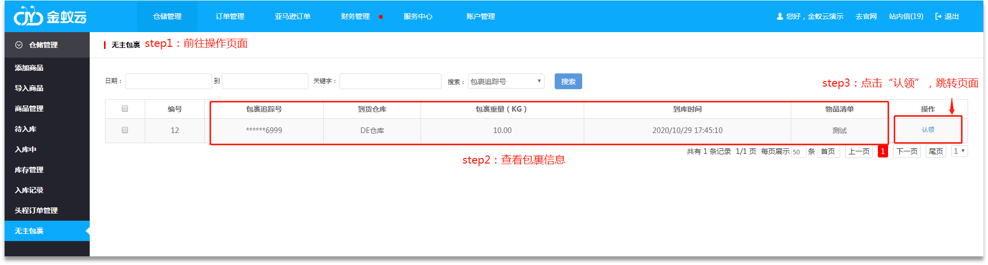 ·管理員會(huì)將無人認(rèn)領(lǐng)的包裹進(jìn)行系統(tǒng)發(fā)布,用戶可前往【倉(cāng)儲(chǔ)管理】-【無主包裹】核對(duì)包裹信息,進(jìn)行認(rèn)領(lǐng)。