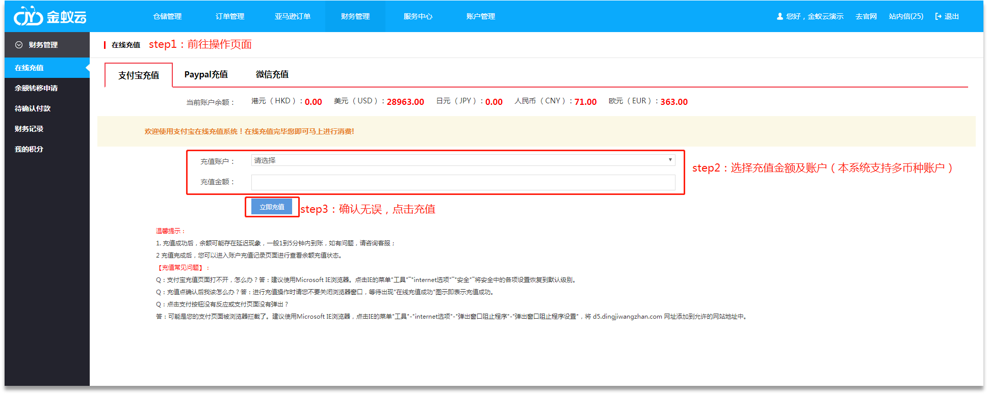 ·本系統(tǒng)支持支付寶、微信、paypal三種渠道充值,用戶可在【財(cái)務(wù)管理】-【在線充值】頁面進(jìn)行充值操作。