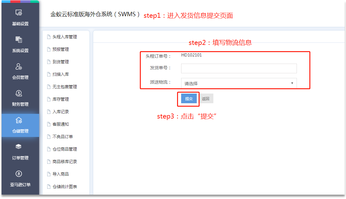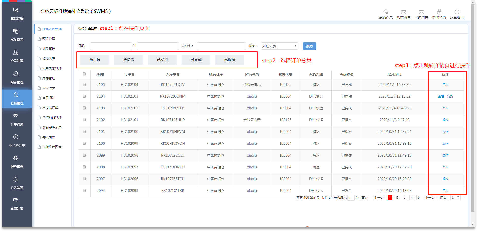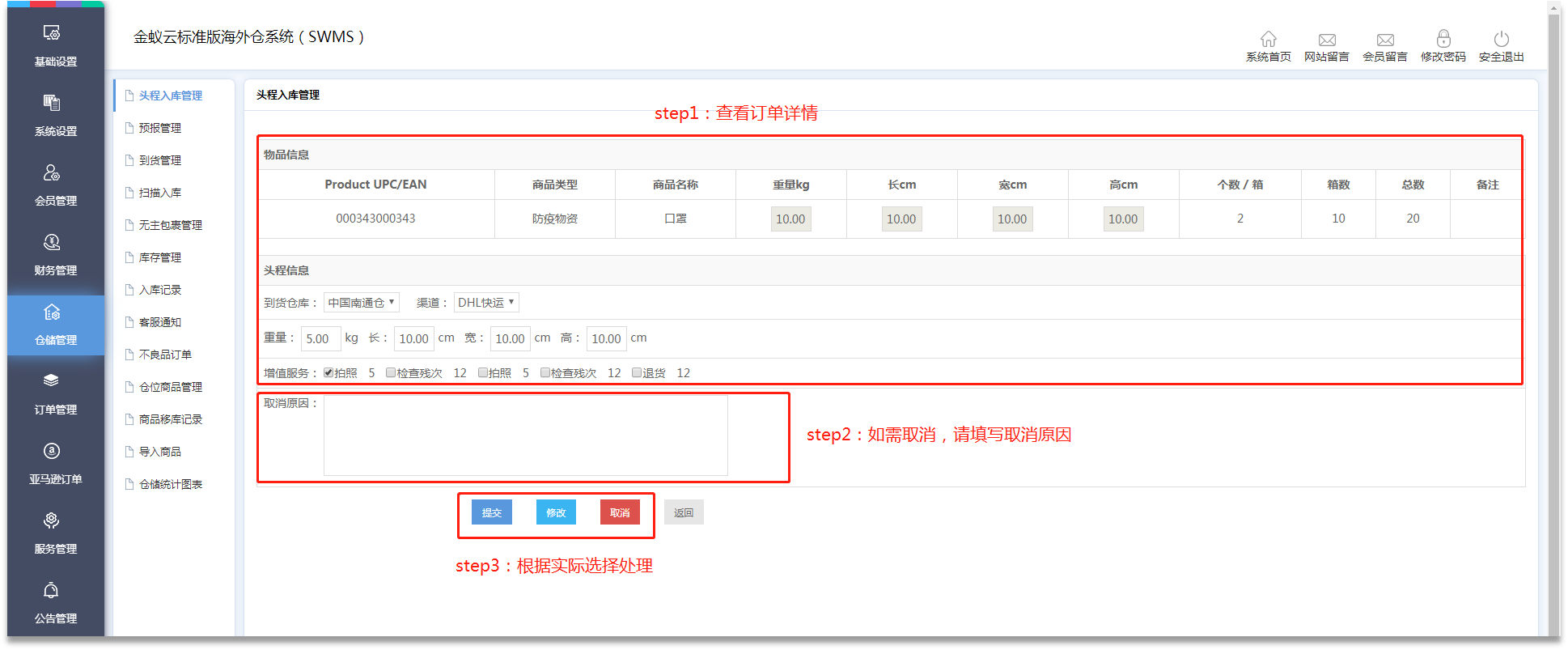 ·會(huì)員提交頭程訂單后,需在【倉(cāng)儲(chǔ)管理】-【頭程入庫(kù)管理】進(jìn)行處理,管理員在待審核訂單處理可選擇提交/修改/取消。