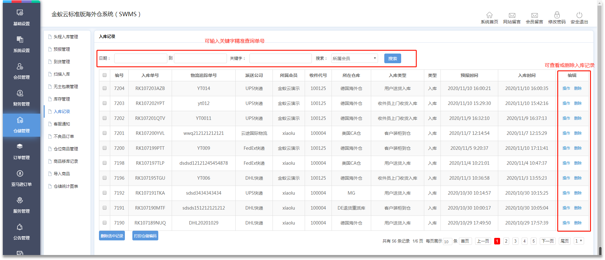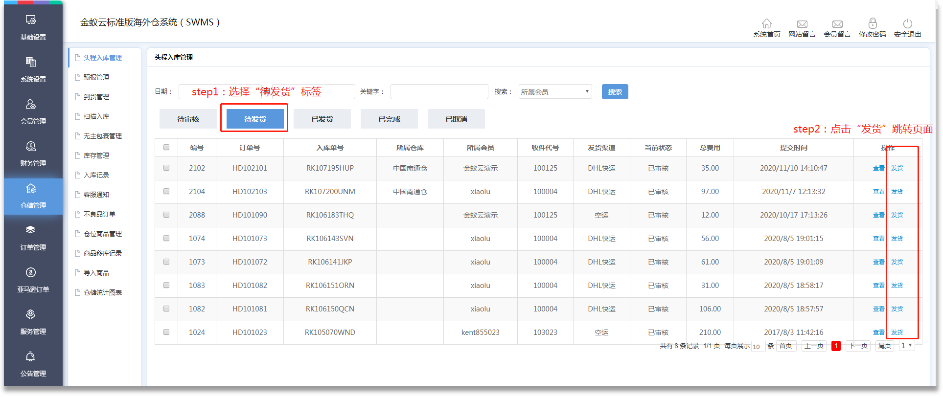 ·訂單處理后,將自動(dòng)進(jìn)入相應(yīng)狀態(tài),管理員可在【倉(cāng)儲(chǔ)管理】-【頭程入庫(kù)管理】頁(yè)面通過(guò)【搜索】,或者在【倉(cāng)儲(chǔ)管理】-【入庫(kù)記錄】頁(yè)面查詢并跟進(jìn)訂單。