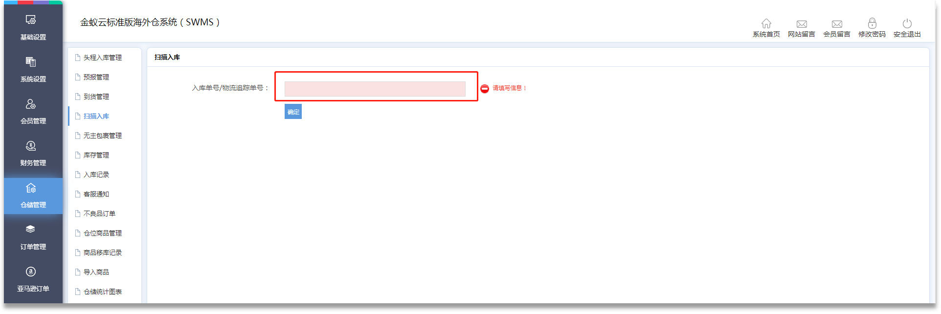 ·貨物到達(dá)倉(cāng)庫(kù)后,管理員需前往【倉(cāng)儲(chǔ)管理】-【掃描入庫(kù)】填入單號(hào),跳轉(zhuǎn)【倉(cāng)儲(chǔ)管理】-【預(yù)報(bào)管理】頁(yè)面完成入庫(kù)操作。