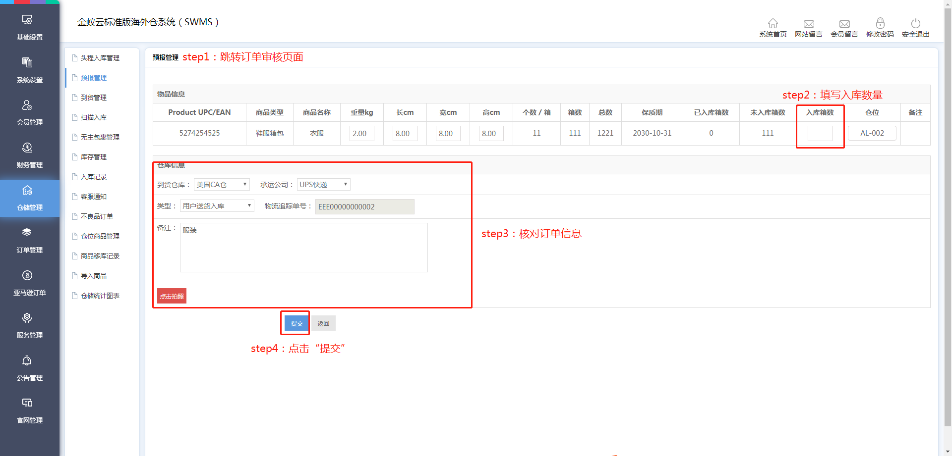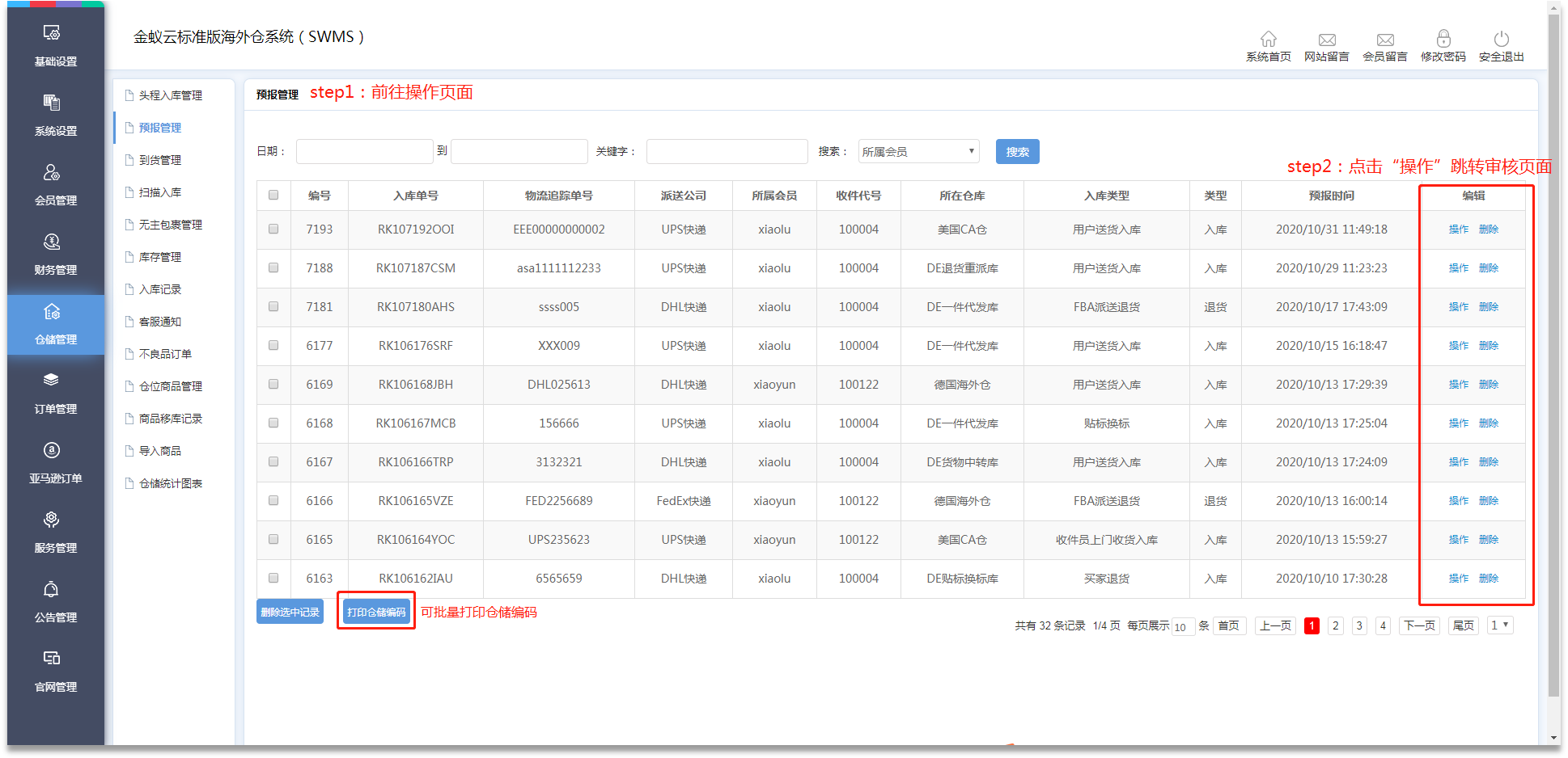 ·會員提交倉儲服務的訂單后,管理員需在【倉儲管理】-【預報入庫】進行審核。