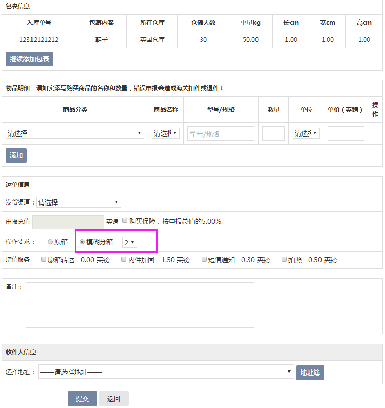 精確分箱:對單個包裹進行分箱,可選擇不同收件人,填寫不同的物品信息;