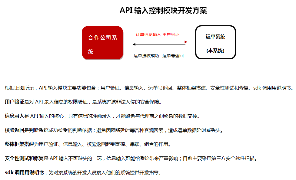 | API接口接入 | 通過接口遞交訂單數(shù)據(jù)對方系統(tǒng),獲取派送單號。 |